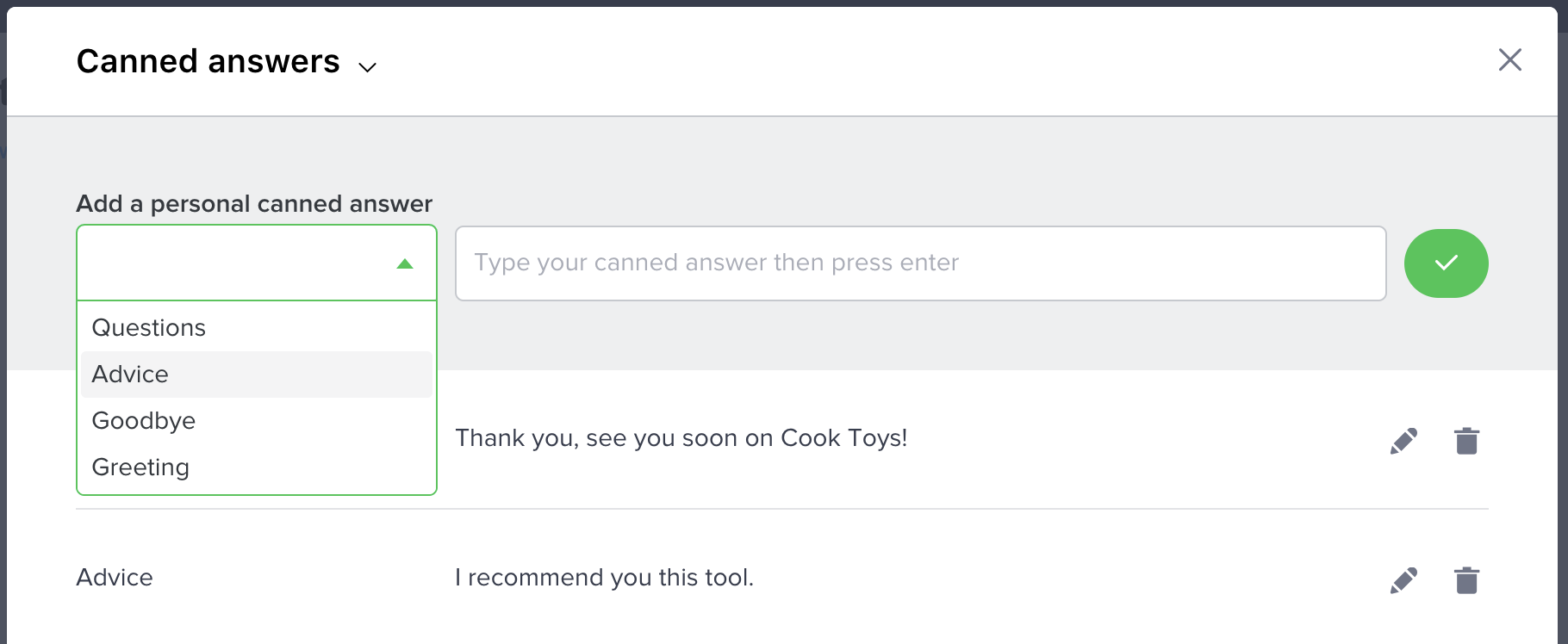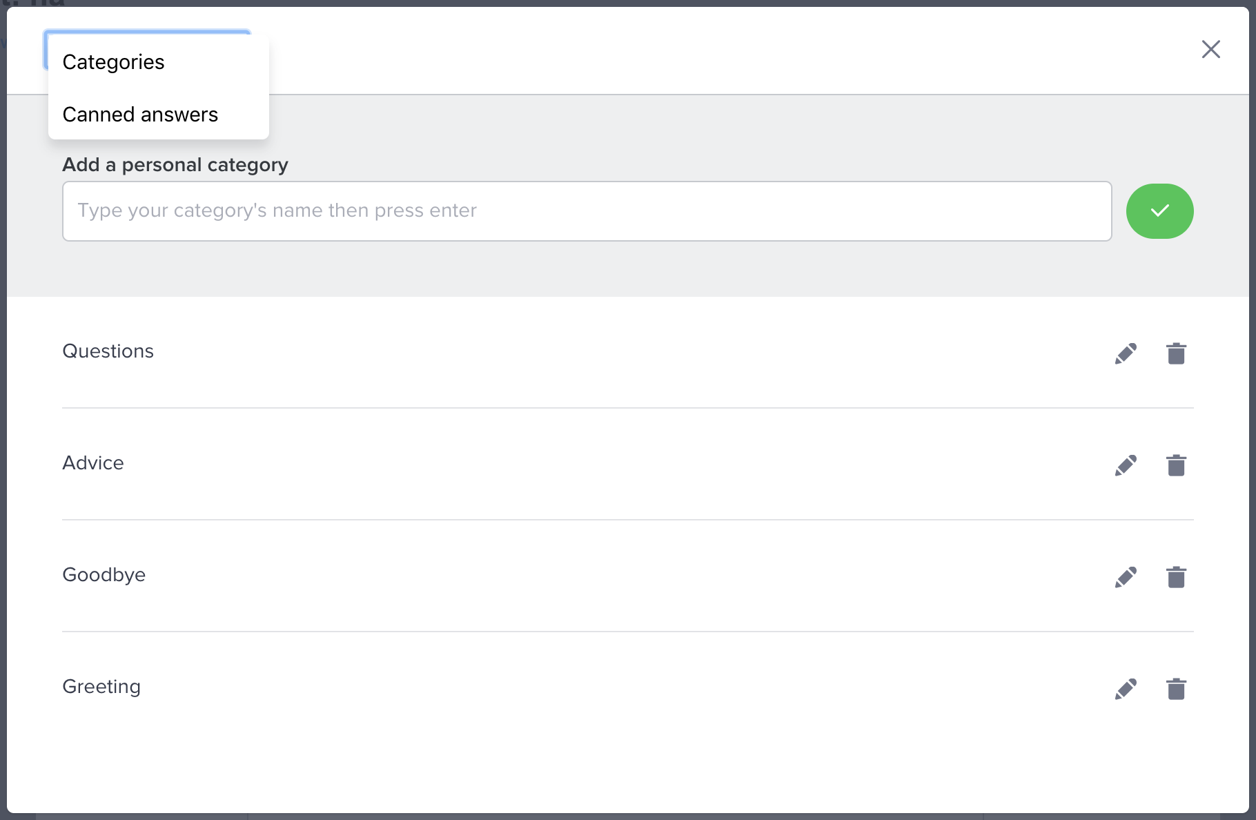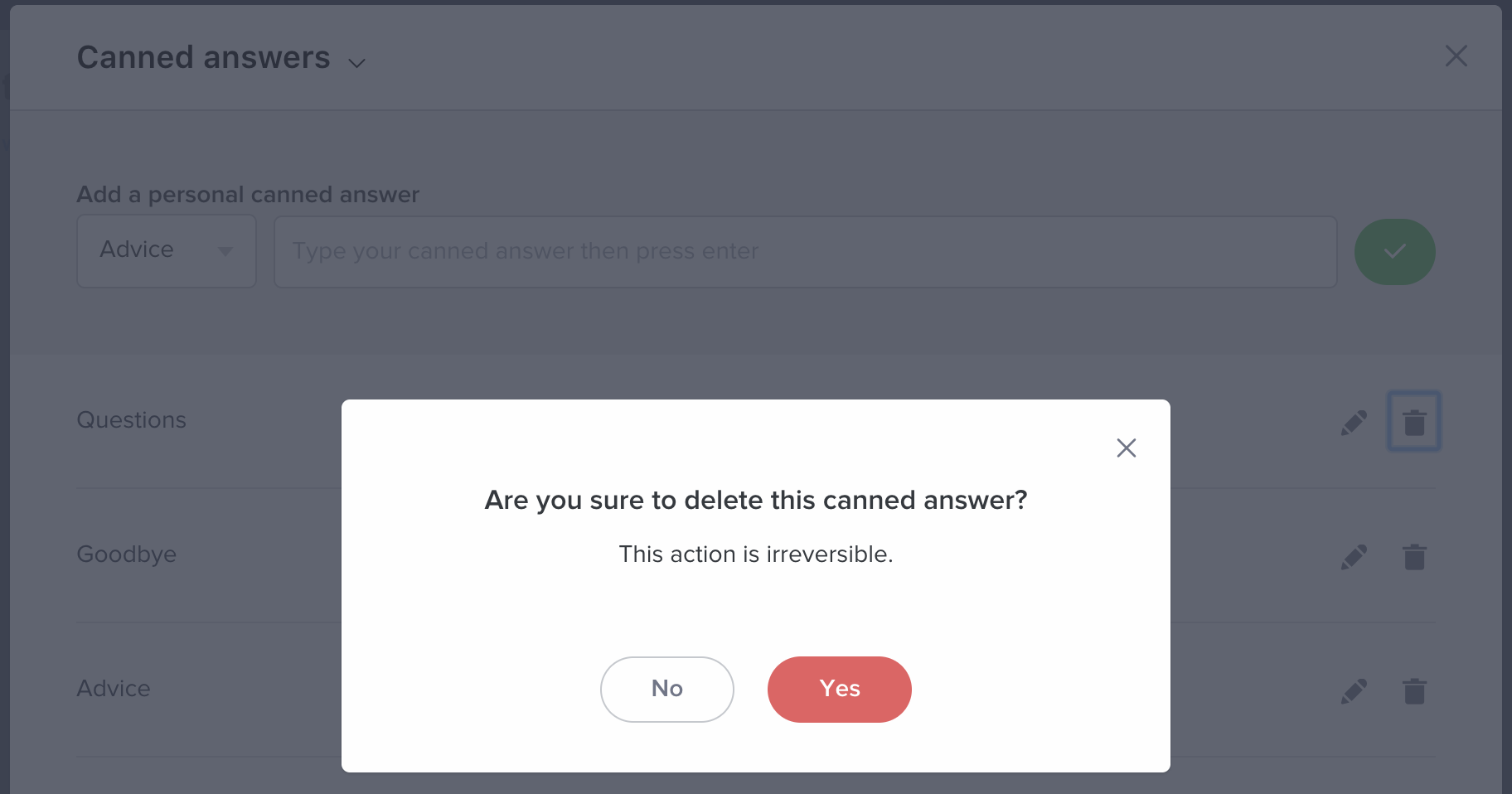 To delete a category and all the canned answers associated with it, click on the trash-can icon on its right, then validate your action by clicking on the "Yes" button.