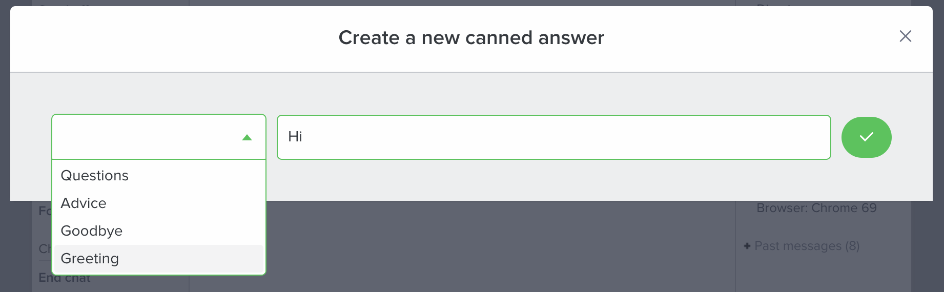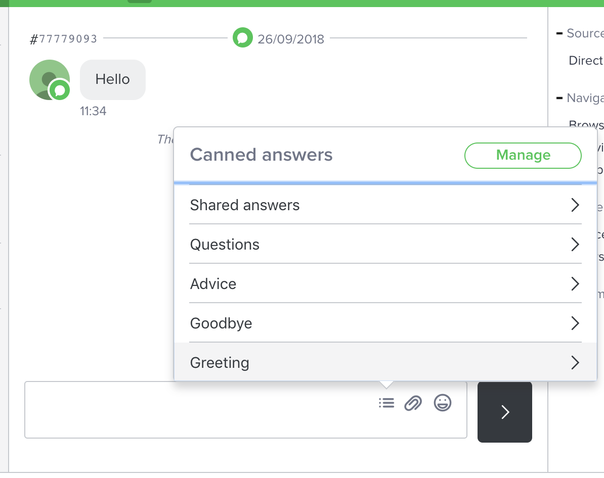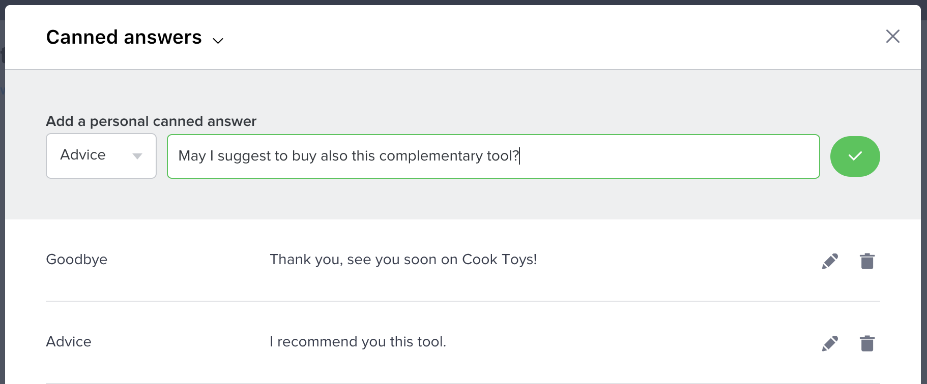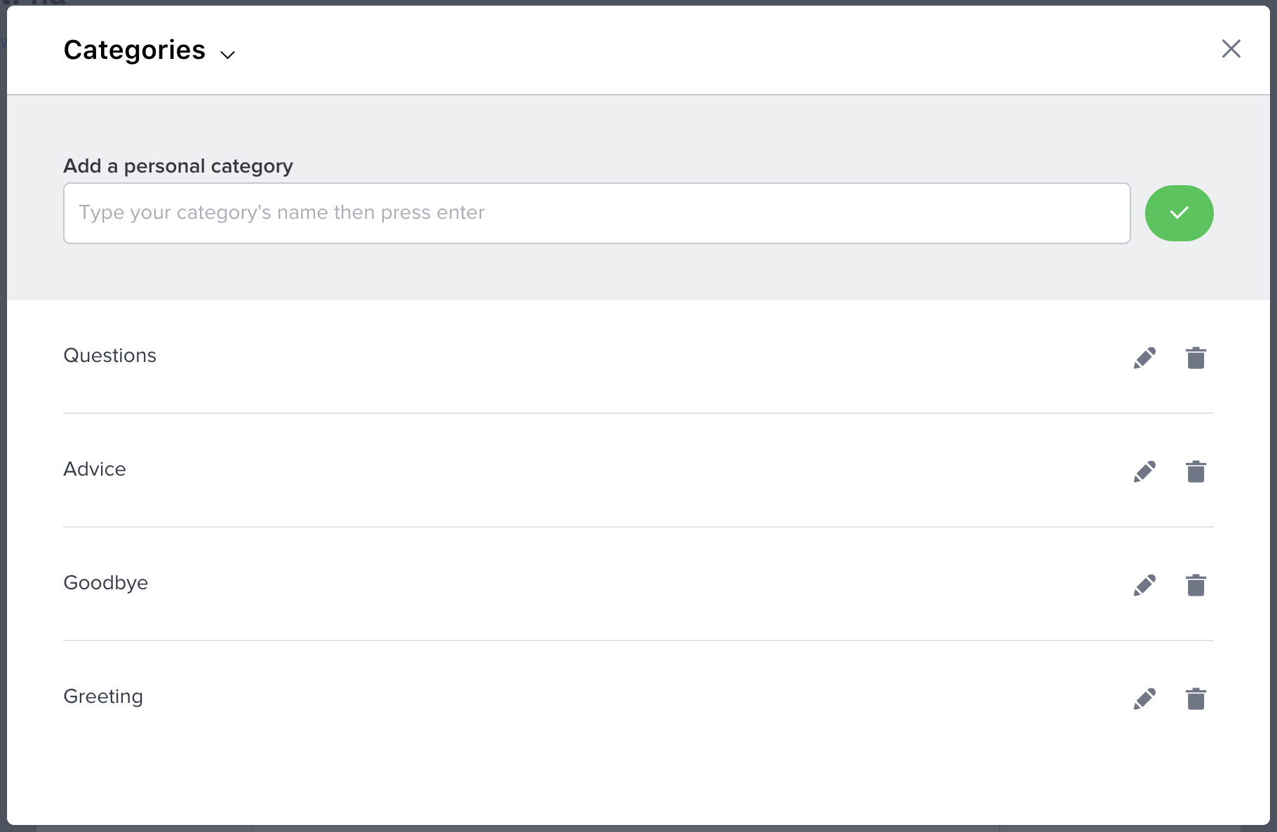 To delete a category and all the canned answers associated with it, click on the trash-can icon on its right, then validate your action by clicking on the "Yes" button.