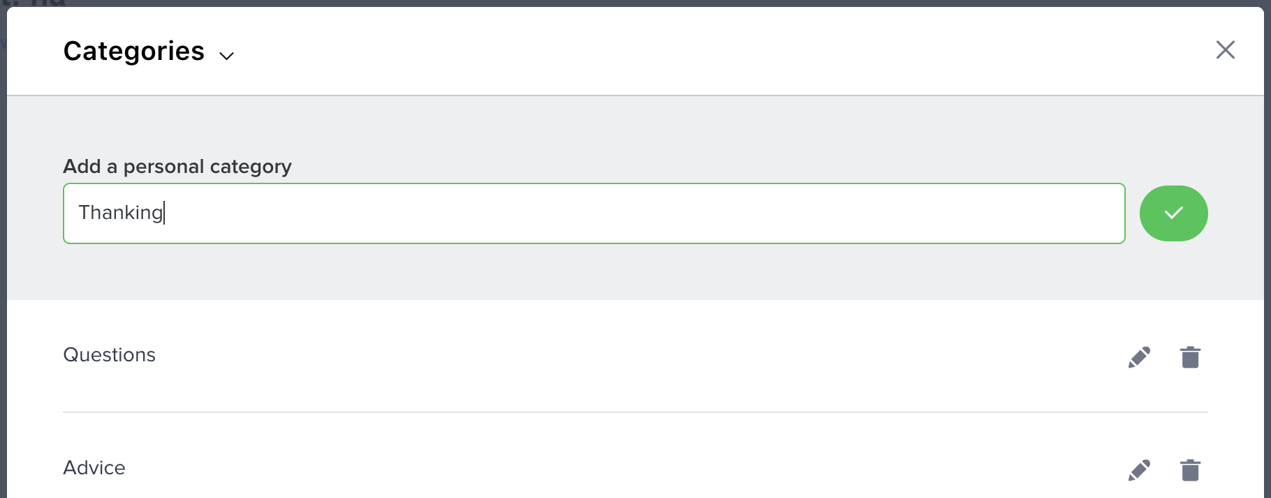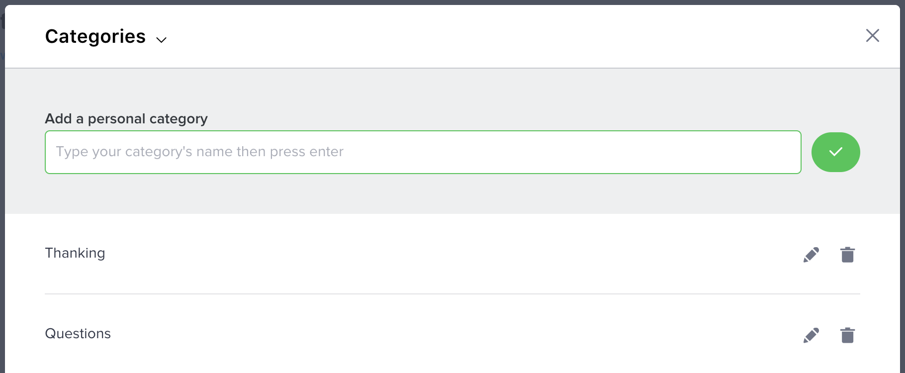 Enter the name of your new category in the text input field and press enter or click on the green button. Your category has been successfully added.